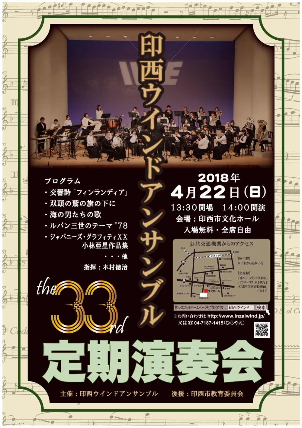 第1部 1. 双頭の鷲の旗の下に 2. 飛行の幻想【VISIONS OF FLIGHT】 3. ロマネスク 4. 海の男たちの歌 5. 交響詩「フィンランディア」 第2部 1. ルパン三世のテーマ ’78 2. ジャパニーズ・グラフィティXX ~小林亜星作品集~ 3. いつか夢で<映画「眠れる森の美女」より> 4. Miracle Shot 5. アメリカン・グラフィティーⅡ アンコール 1. 76本のトロンボーン 2. 印西ウインドアンサンブルのテーマ「風のように」